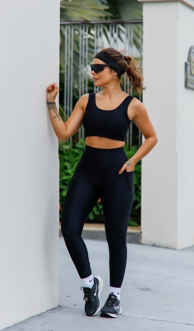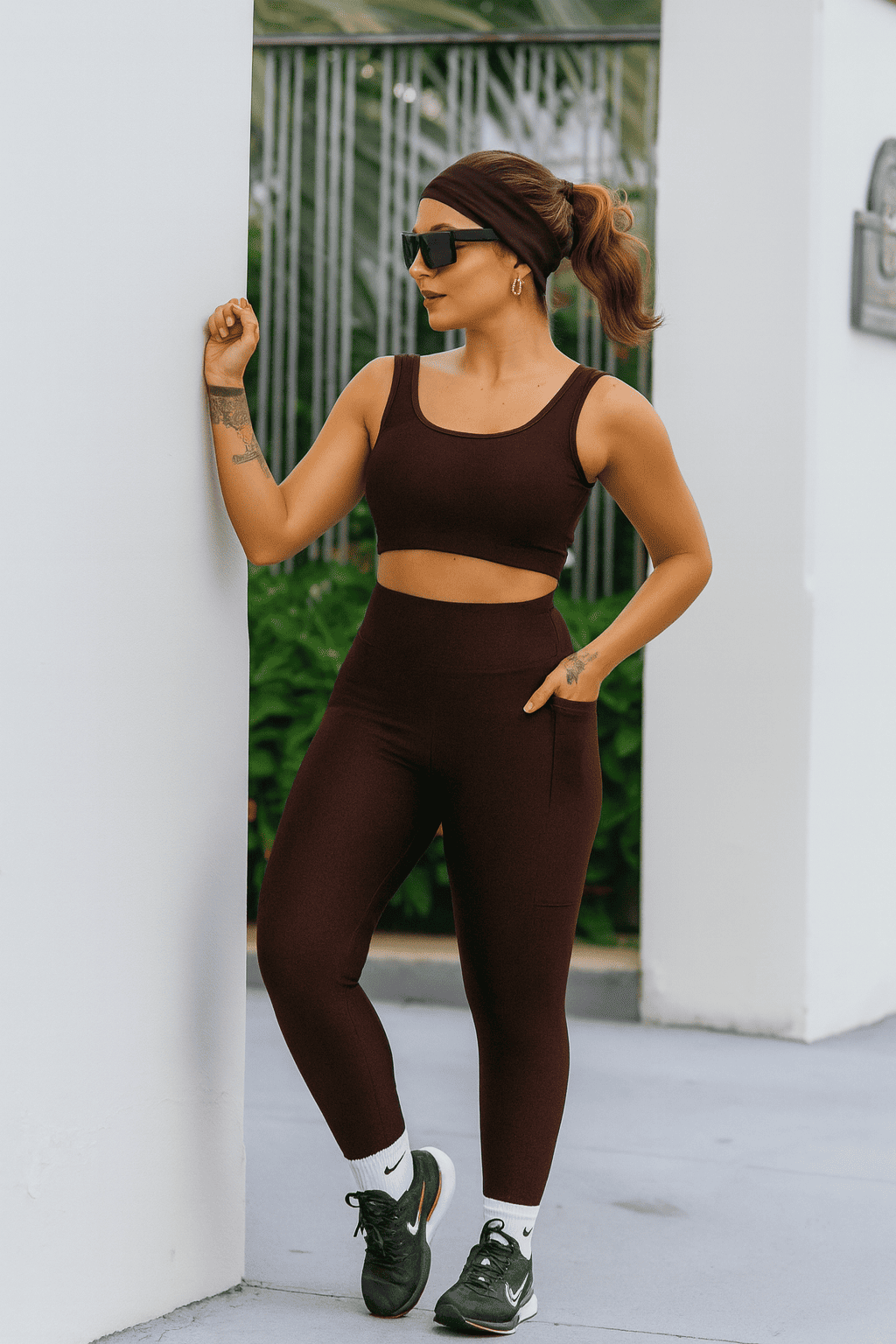 A legging vem com bolso funcional que faz toda a diferença no dia a dia, e o top com bojo removível garante conforto e sustentação.